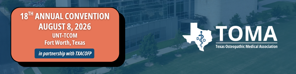 Join TOMA for the 18th Annual Convention, presented in partnership with TXACOFP, at the University of North Texas Texas College of Osteopathic Medicine in Fort Worth. This one-day conference will bring together Texas osteopathic physicians and partners for education, connection and collaboration, followed by a special evening reception. Registration and sponsorship information will be available soon, with additional details to be announced as they are finalized.