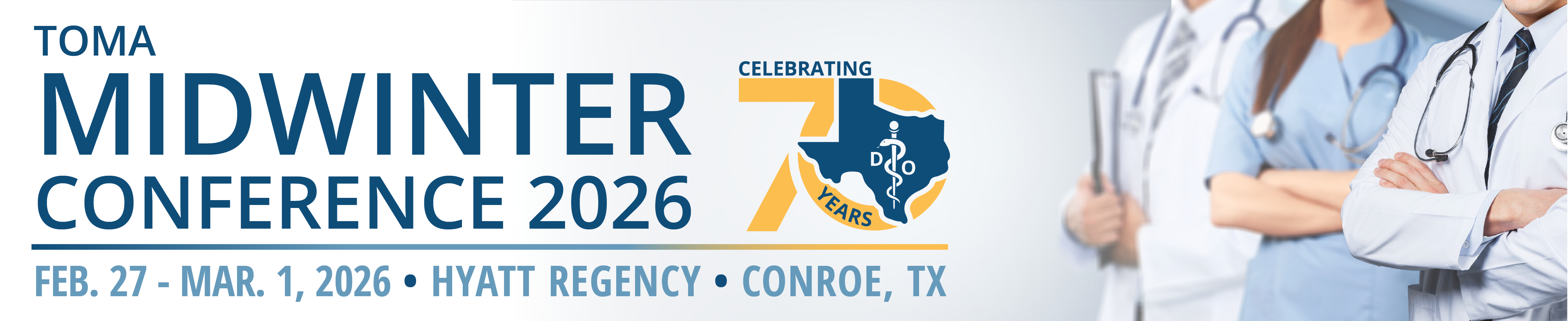 70th Annual MidWinter Conference: Sponsorship OpportunitiesSupport TOMA by becoming a valued sponsor at this pivotal conference in Conroe, Texas. Sponsorship opportunities for the 2026 MidWinter Conference offer meaningful visibility and engagement with osteopathic physicians, residents, students and healthcare leaders from across the state. With options designed for a variety of budgets, sponsors can showcase products and services, build lasting connections and align their brand with our attendees and the future of osteopathic medicine. View our sponsorship prospectus and become a sponsor today. Benefits:
